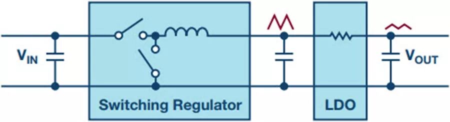 人们常常使用线性稳压器代替无源LC滤波器来清理开关稳压器产生的电压。它们通常具有很高的电源电压抑制比(PSRR)。这意味着,线性稳压器的大部分输入纹波会被阻挡,因此线性稳压器的输出纹波很少。此外,线性稳压器的输出电压有自己的闭环回路,因此会进行较好的精确调节。