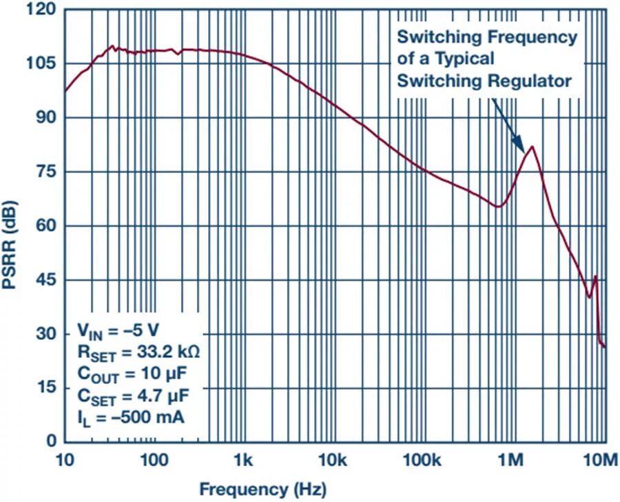 图3:LT3094线性稳压器针对负电源电压的电源电压抑制比