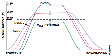 该ADC的问题与基准电压有关,它必须小于AVDD + 0.3 V。因此,AVDD必须先于基准电压或与之同时上电。